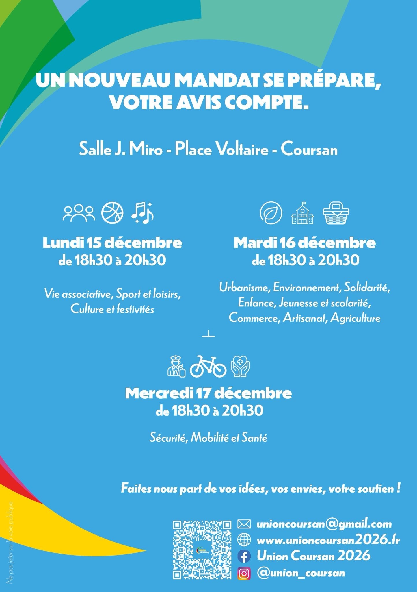 Nous souhaitons construire un programme qui reflète les besoins et les aspirations de tous les Coursanaises et les Coursannais. Venez partager vos idées et vos préoccupations lors de nos prochaines réunions.